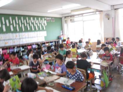 小さな生き物を観察しました。グループでキャベツの葉の上の幼虫をしっかりと観察しました。