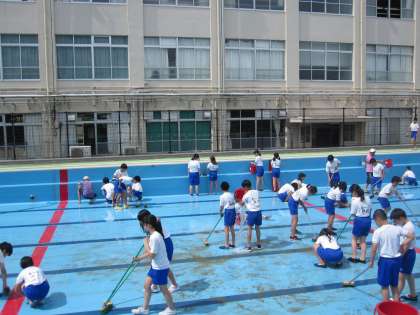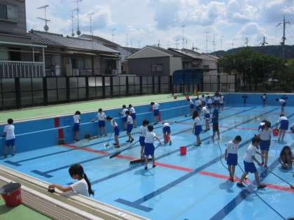 水泳学習に向けて,6年生がプールをきれいに掃除をしました。プールにこべりついていた藻などを一生懸命掃除をしていました。