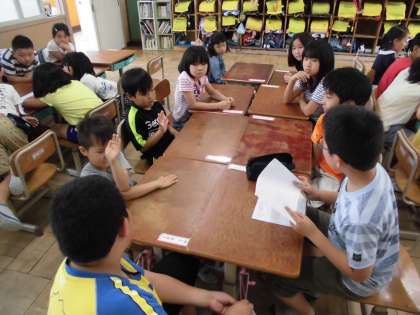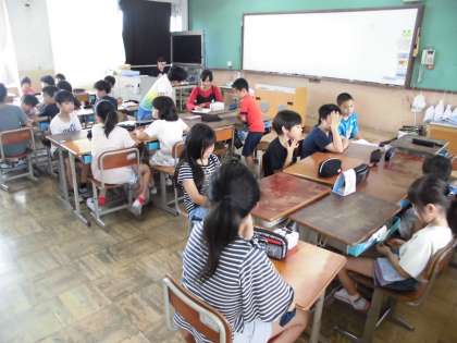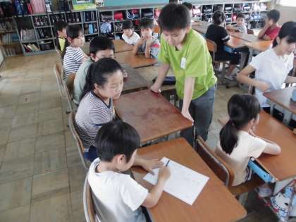 各教室にたてわりグループで集まり、名簿作りから始めました。6年生が、上手にリードしていました。
