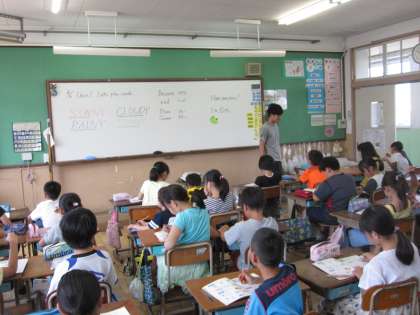 天気を表す英語を使って,学習をしました。テレビから流れてくる英語を聞き取って,どんな単語が聞こえてくるのかを交流しました。