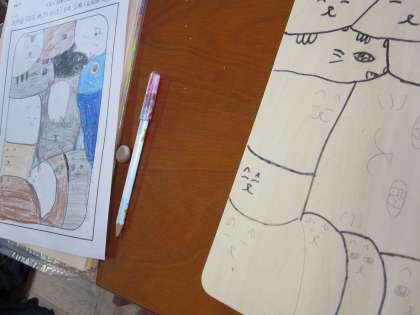 木の板を糸のこで切ってパズルを作るための構図を考えました。考えた構図を木の板に描いていきました。