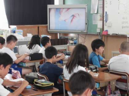 5年生の家庭科では,裁縫の学習をします。今日は,先生のお手本を見ながら,玉結びの方法を学習しました。