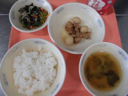 「『鶏肉のさっぱり煮』は、うずら卵とお肉に味がしみていて、おいしいー。『小松菜と切干大根の煮びたし』は、だしの味がしみこんだ、やさしい味で美味しいです。『みそ汁』は、わかめと豆腐の具が美味しいです。」など、いろいろな給食の話などをしてくれて、楽しくいただきました。