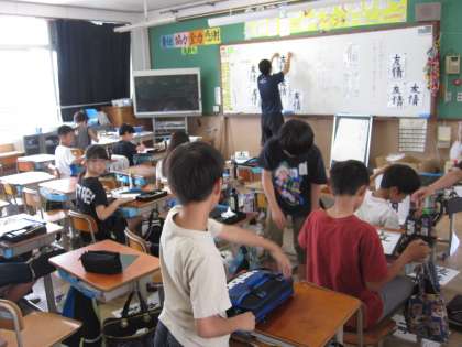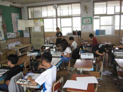 「友情」を毛筆で書きました。文字を整え,はらいやとめを大切にしながら書くことができました。