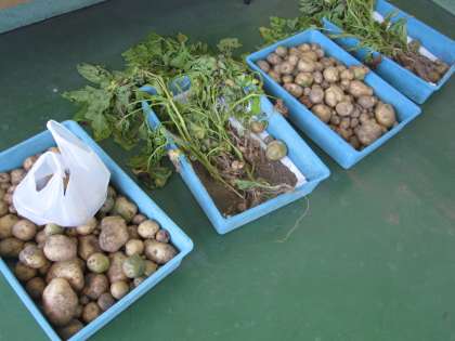 理科の学習で育てていたジャガイモができ,収穫しました。1つの花壇からたくさんのジャガイモがとれました。