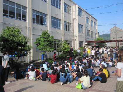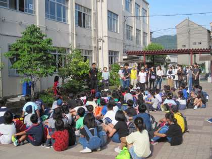 みさきの家の当日になりました。天候に恵まれた出発式になりました。代表の児童が司会を務め,まずは引率の教職員の紹介が行われました。