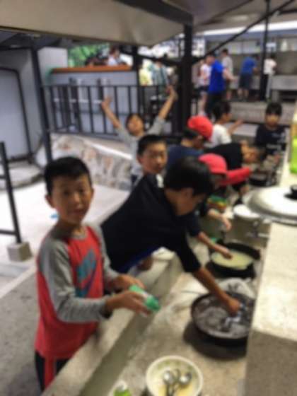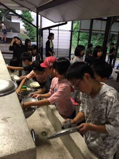 食事の後はみんなで片付けをしています。お風呂は予定より遅くしてもらいました。