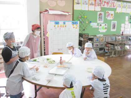 餃子の皮を使った簡単にできるピザを作りました。自分たちで盛り付けを考えてしました。