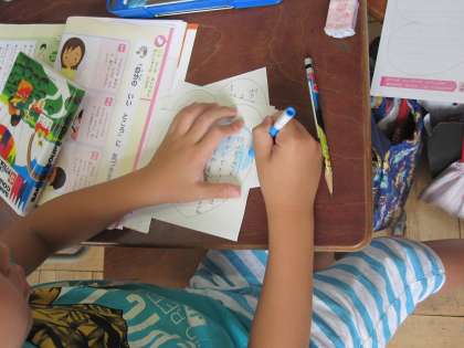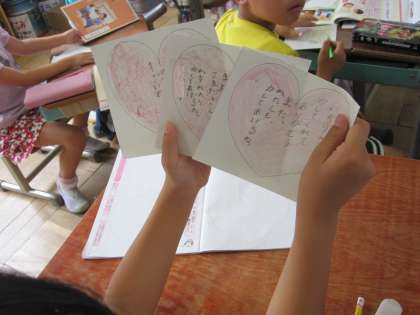 自分のいいところ,友達のいいところについて考えました。友達のいいところをハートの紙に,いっぱい書きました。