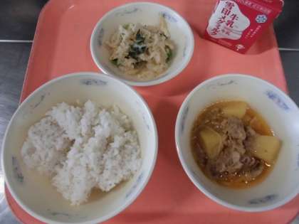 子どもたちから、「『肉じゃが(ピリカラみそ味)』が、少し辛みが合って、ご飯にもよく合って、とっても美味しかったです。『切干大根の煮つけ』は、切干大根のシャキシャキかんと、油揚げに出しの味がしみていて、美味しかったです。」と、感想をくれました。
