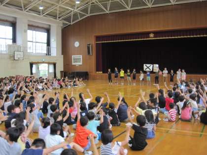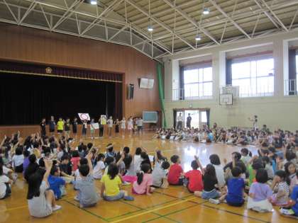 たてわりオリエンテーリングの前に,保健委員会から熱中症についてのお知らせを全校に行いました。児童が中心となって○×クイズを出しながらお知らせしました。