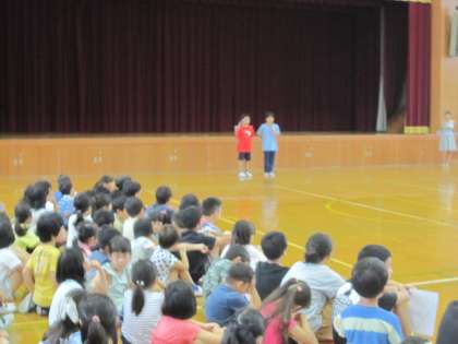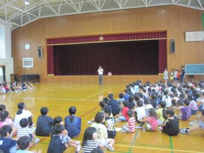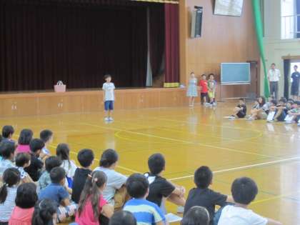 運営委員が中心となって,たてわりオリエンテーリングを始めました。はじめに学校長がオリエンテーリングで大切にしてほしいことを話されました。その後,児童代表が開始のあいさつやルールについて話をしました。