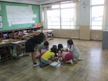 音楽室では,リズムつなぎをして,グループでどれだけつないでいけるかを楽しみました。5年生の教室では,間違い探しを頭をくっつけてみんなで探していました。