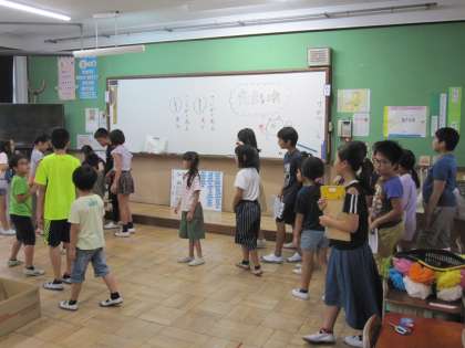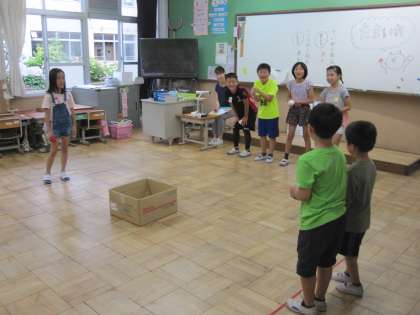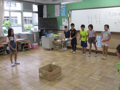 1年生の教室では,グループで玉入れにチャレンジして,学年ごとに距離が異なるところから玉入れをしました。