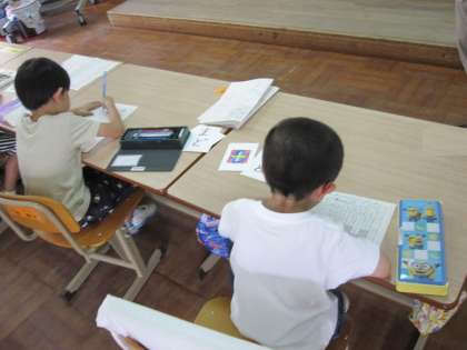 絵から言葉を書いたり,かるたに書かれた言葉からプリントにひらがなをかいたりして学習しています。