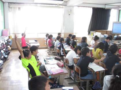 合同な三角形のかき方について学習しました。自分たちの考えを教材提示装置に映し出しながら説明し,理解を深めました。