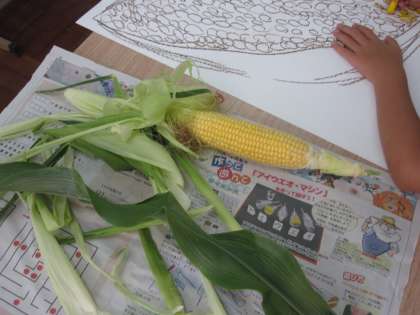 トウモロコシを収穫し,トウモロコシの絵を描きました。クレパスを使って,一粒一粒,しっかりと色を塗りこみました。