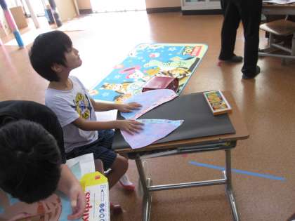 絵を仕上げるために熱心に色をぬりました。卵の中から出てくるものを考えました。