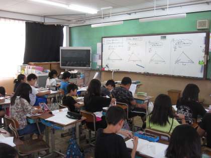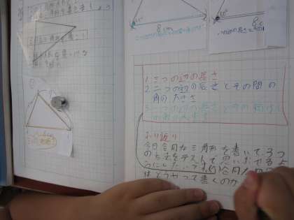 合同な三角形をいろいろな条件のもとでかいていきました。コンパスや分度器を使ってかくことができました。