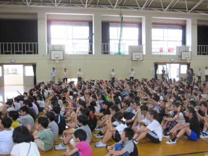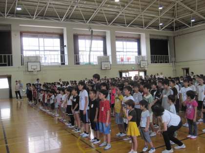 1学期終業式を行いました。初めに校歌を歌いました。その後,校長先生から,夏休み中に大切にしてほしい3つの「あ」について,お話がありました。