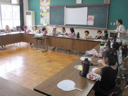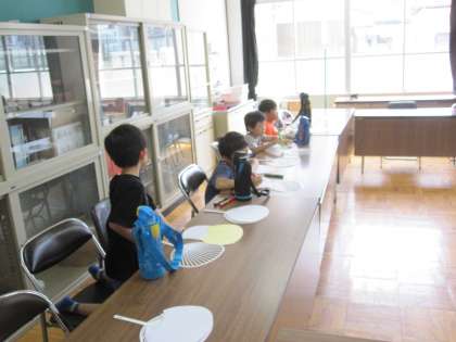 うちわ作りでは,主にペンを使って好きな絵柄を描いています。