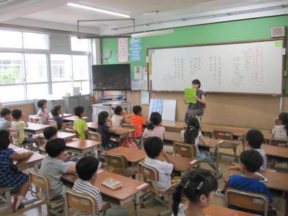 夏休み中の登校日に,子どもたちは元気な姿を見せていました。3組では,いつものようにあいさつをして,朝の会をしました。1年生は学校図書館に行って,本を読んだり借りたりしました。