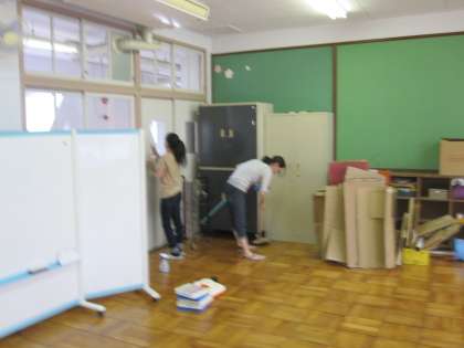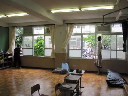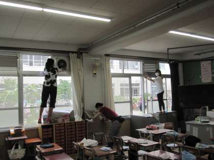 校内の各教室では,保護者の方々が扇風機を外して掃除したり,窓の上のところまでふいていただいたりしました。