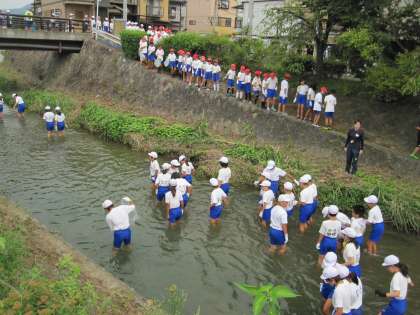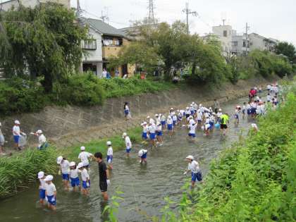 有栖川では,4〜6年生の子どもたちが川に入って,川のごみを拾いました。普段できない川の掃除をすみずみまで行いました。