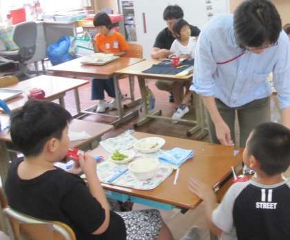 2学期になり,初めての給食を食べました。魚の骨をとって,みんなで楽しく食べました。