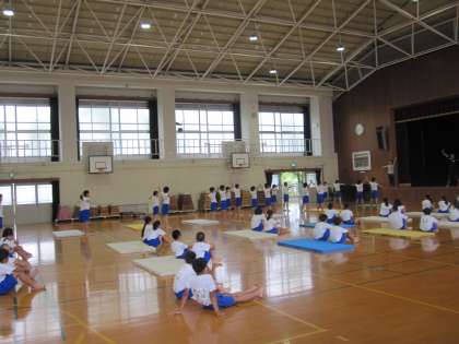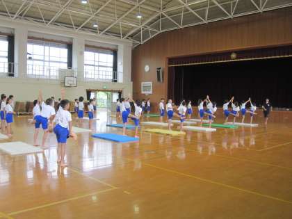 2人技の練習をしています。バランスをとりながら,タイミングを合わせて,技の完成度を高めています。