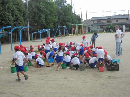 砂場で,子どもたちは水で湿らせた砂で高い山を作ったり,大きな池を作ったりしていました。