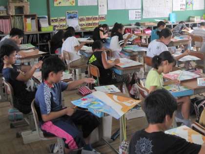 お話の絵の彩色に入っています。筆を立てて,ていねいに色を付けていました。