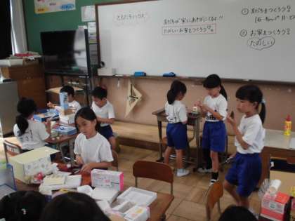 今日の図工は,楽しいお家を作ります。どんなお家がいいなイメージを膨らませながら,材料を組み合わせていました。