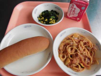 子どもたちから、「『イタリアンスパゲティ』は、ズッキーニの味が美味しくて、スパゲティのソースに甘味があって美味しかったです。『ほうれん草のソテー』は、コーンの甘味があって美味しかったです。」と、感想をくれました。