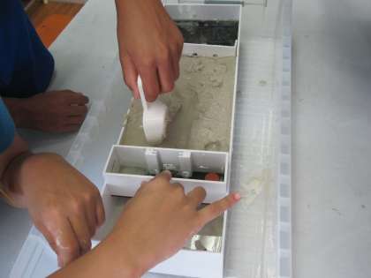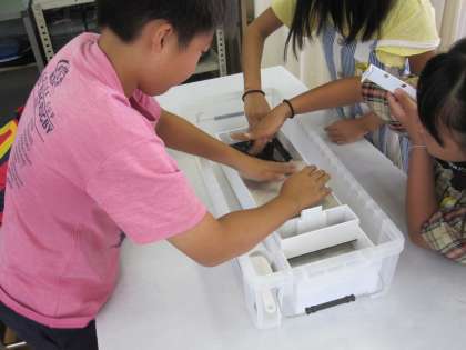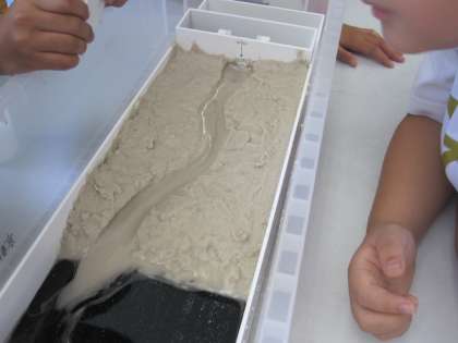 川の道を作り,カーブや直線ではどのように水によって削られるのかを観察して,水のはたらきについて考えました。