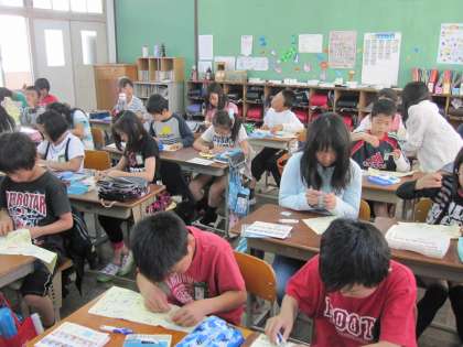 待ちに待った家庭科の裁縫の実習が始まりました。玉結び,玉止めの練習をしました。慎重に慎重に取り組んでいました。うまくできると,歓声があがっていました。これから,なみ縫い,返し縫いと練習し,ナップサック作りに進んでいきます。