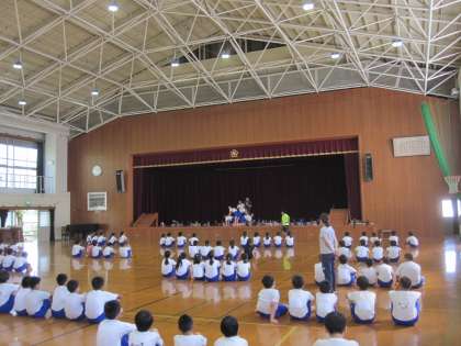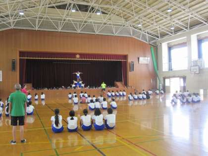 5・6年生合同で,組体操の練習をしています。5人技に取り組み,顔のあげ方,とまっているときの姿勢などを確認しながら進めています。
