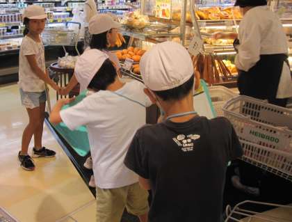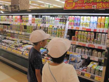 スーパーの中では,パンの売り方,ジュースなど商品の並べ方などの工夫を探しました。