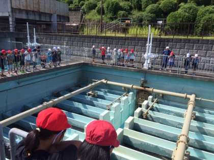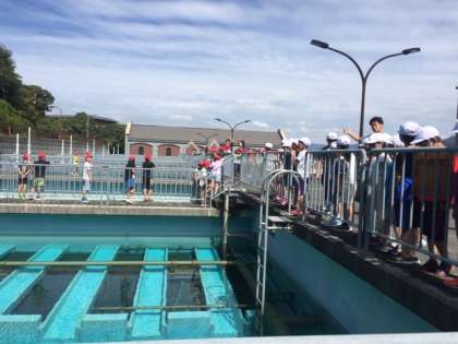 水がだんだんときれいになっていく様子を見学しています。