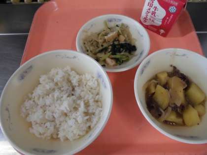 子どもたちから、「『肉じゃが』は、あつあつで、牛肉も軟らかくて、こんにゃくにも味が浸み込んでいて、おいしかったです。また、食べたいです。『切干大根の煮付け』は、味がさっぱりしていて、美味しかったです。」と、感想をくれました。