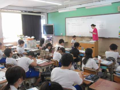 分母の異なる分数の大きさを比べるにはどのようにすればよいかを学習しました。5年生が3つの教室に分かれて学習をしています。