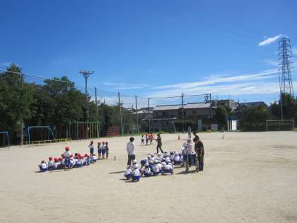 運動場で,おみこしを担いでリレーをする練習をしました。おみこしの渡し方を確認しました。