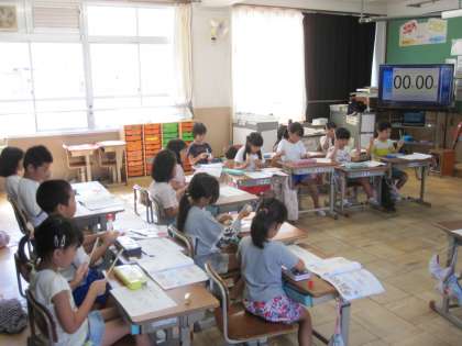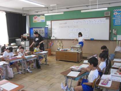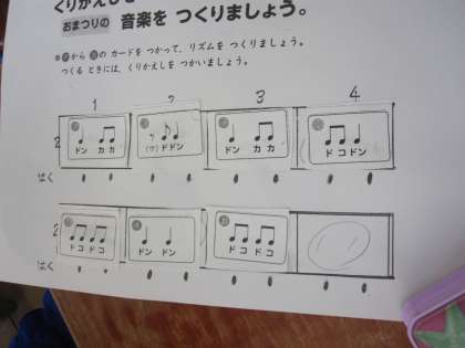 わりばしをバチに見立てて,自分たちで組み合わせたリズムを打ちました。八分音符と四分音符のリズムをたたくのに苦戦していました。