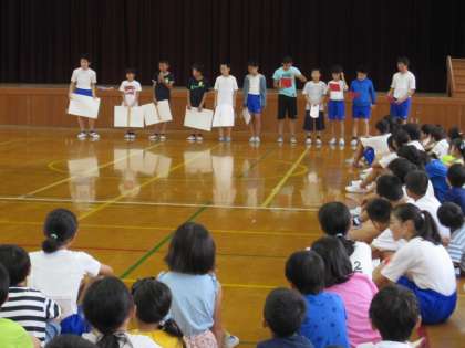 なかよし集会を行いました。運営委員が司会をして,会を進めています。今日は,環境委員がごみの分別のことなどについて,○×クイズをしました。