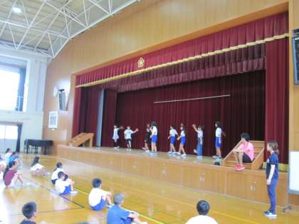 中間休みに全校ダンスの練習をしています。係の子どもたちが中心となって,教えています。