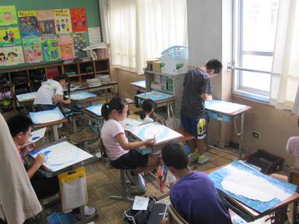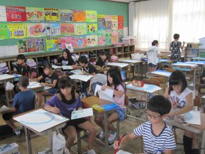 お話の絵の背景の色を付けていきました。色のおき方を考えて,場面の様子を表現することができました。