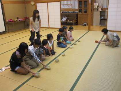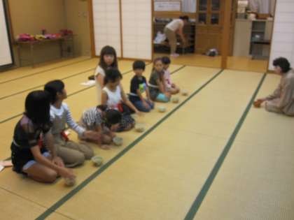 茶道体験教室では,今月から1年生も参加し,先生に立ち方やお菓子の食べ方などを教えてもらっていました。