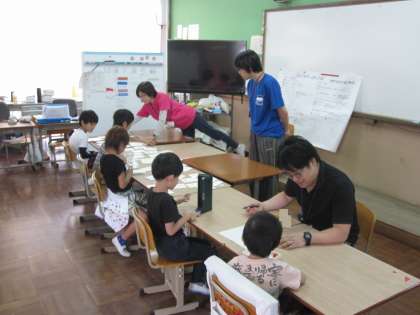 プリントを使ったり,かるたを使ったりして,学習をしています。かるたでは,音の数を確認しながら,札を選んでいます。