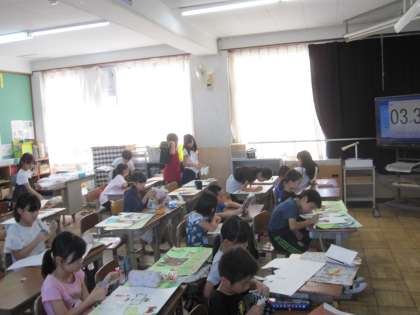 お話の絵の学習をしました。熱心に彩色し,登場人物を加えて描いていました。