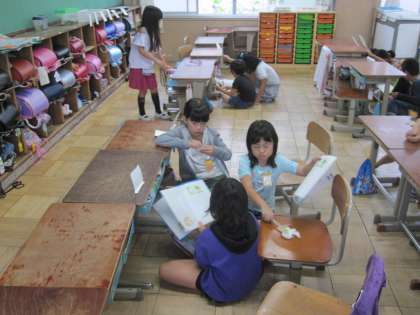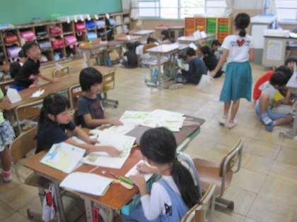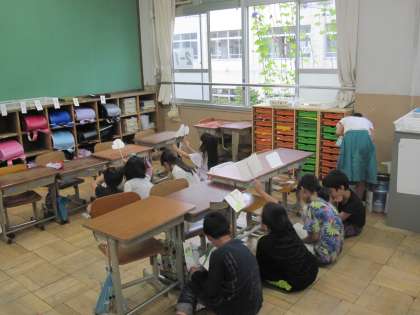 「お手紙」を学習して,ペープサートで音読劇をする練習をしています。学年で発表会をするために,グループで何回も話し合っています。